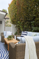 It's amazing what a fresh coat of paint and new shutters can do for an exterior facade! We kept the layout of four loungers from the previous owners, but also added the cream and coral umbrellas and coral rounded bolsters to give a nod to the Coral Casino that Gray has photographed here locally in Santa Barbara.